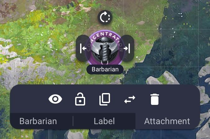 Here you can see that the Concentration token has been selected by first selecting the Barbarian token then selecting the Attachment tab.